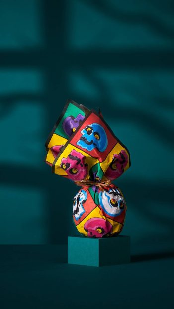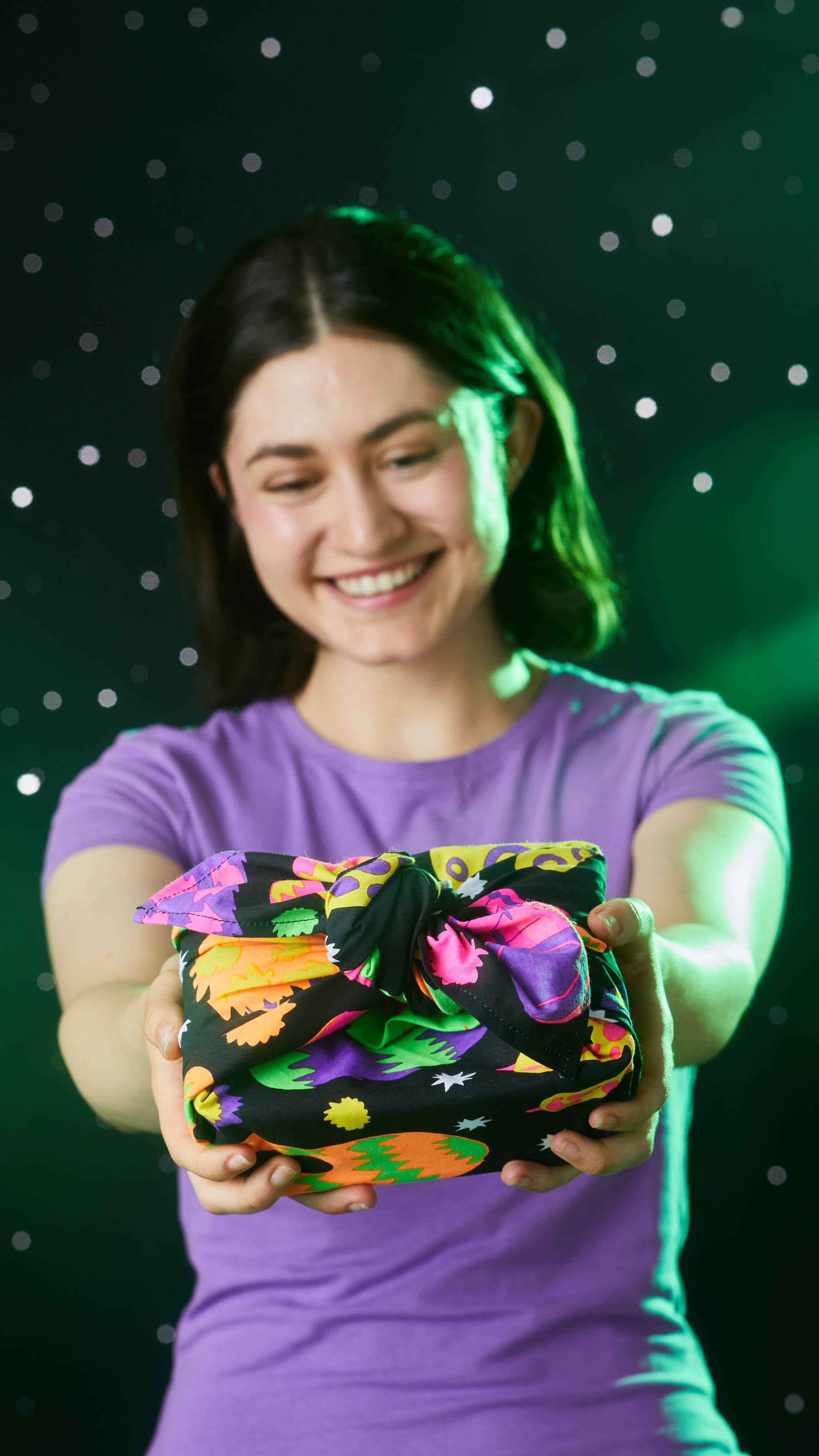 Made from 100% organic cotton, this Knot Wrap is made by the talented artisans of Re-Wrap, a social enterprise in India focusing on environmental and social change. Measuring 27.5′ x 27.5′ and showcasing a design that harks back to the vibrant colors of the ’90s, Hairy Monster Feet’s nostalgic design makes a perfect luxury gift wrap for your favorite Lush products, as well as a gruesomely good seasonal scarf or bandana.